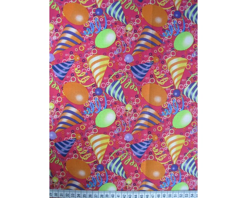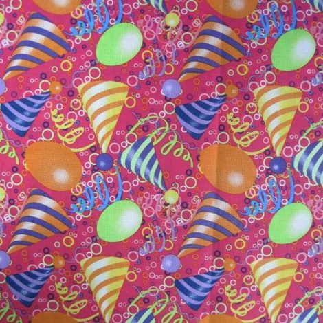 A fun 100% cotton fabric featuring party hats, balloons and streamers on a cerise background, ideal for dressmaking, tableware, bunting and craft projects.