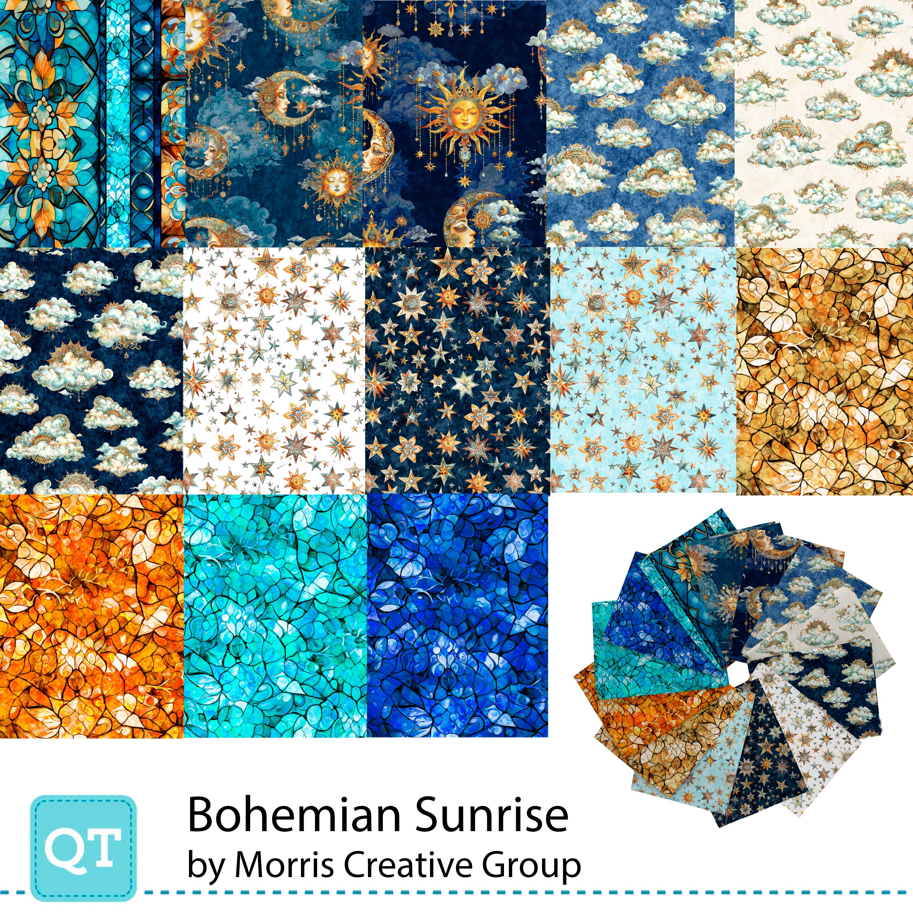 The stunning Bohemian Sunrise collection by Morris Creative Group for Quilting Treasures features beautiful celestial prints in shades of blue and gold. At the heart of the collection is the fabulous Bohemian Sunrise Panel featuring a celestial sun and moon design. In addition, there is a Celestial Patches panel with 16 individual celestial blocks. To complement the panels, there are six allover fabrics available including a celestial stripe print, celestial sky and cloud prints on navy, star prints on navy and white and a royal blue blender. These are premium quality 100% cotton fabrics, perfect for quilting, patchwork, dressmaking and craft projects.