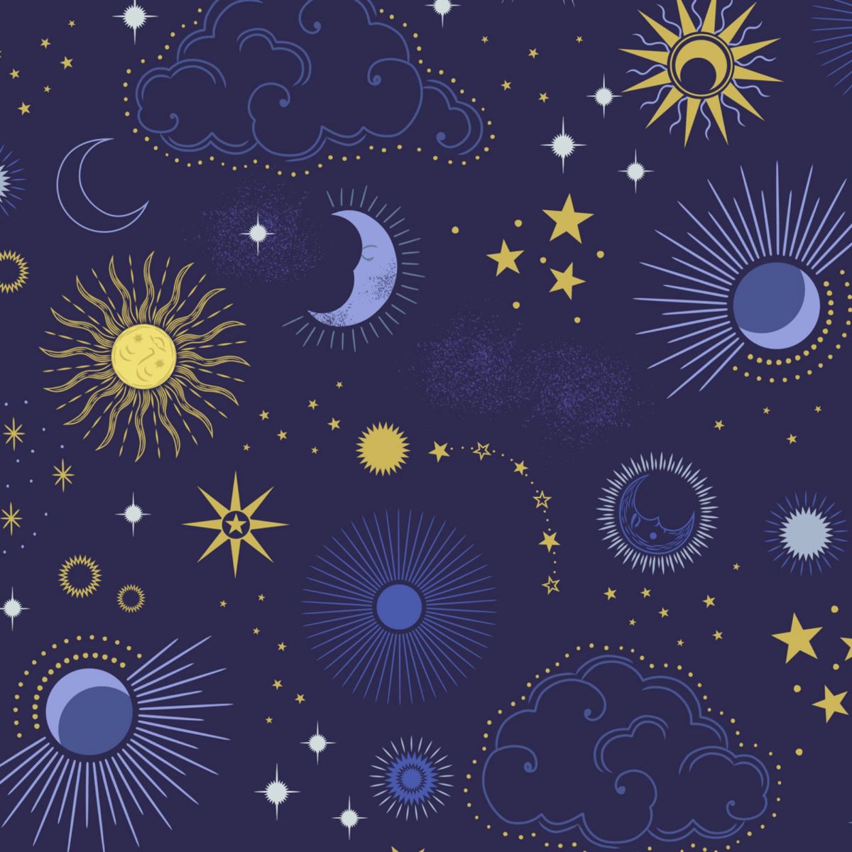 This beautiful metallic print from Lewis and Irene’s Celestial collection features suns, moons, stars and clouds on a midnight blue background, enhanced with gold metallic elements.
