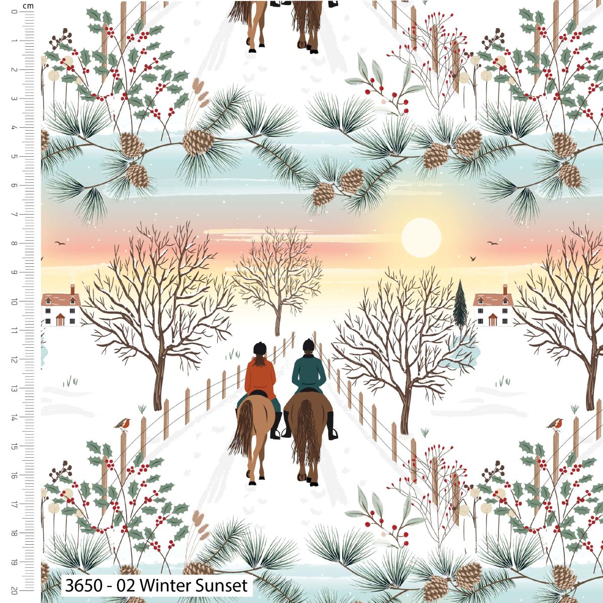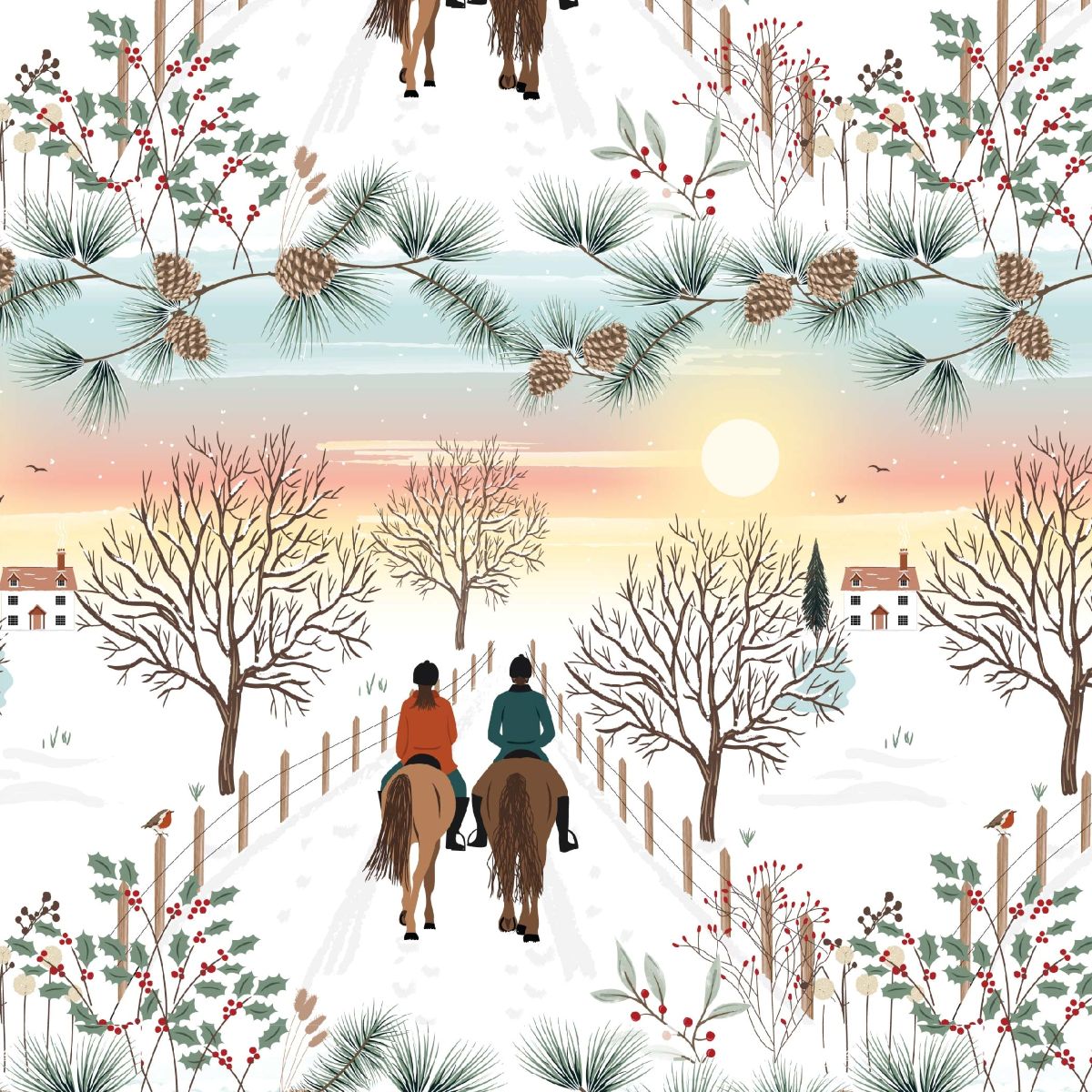 These pretty Christmas in the Country fat quarters created by Victoria Louise Design for The Craft Cotton Company are inspired by winter walks and farmlife in the British countryside. The fabrics feature five designs including a country walk; Christmas birds; a squirrel, robin and foliage print; forest trees and a sunset horseride.