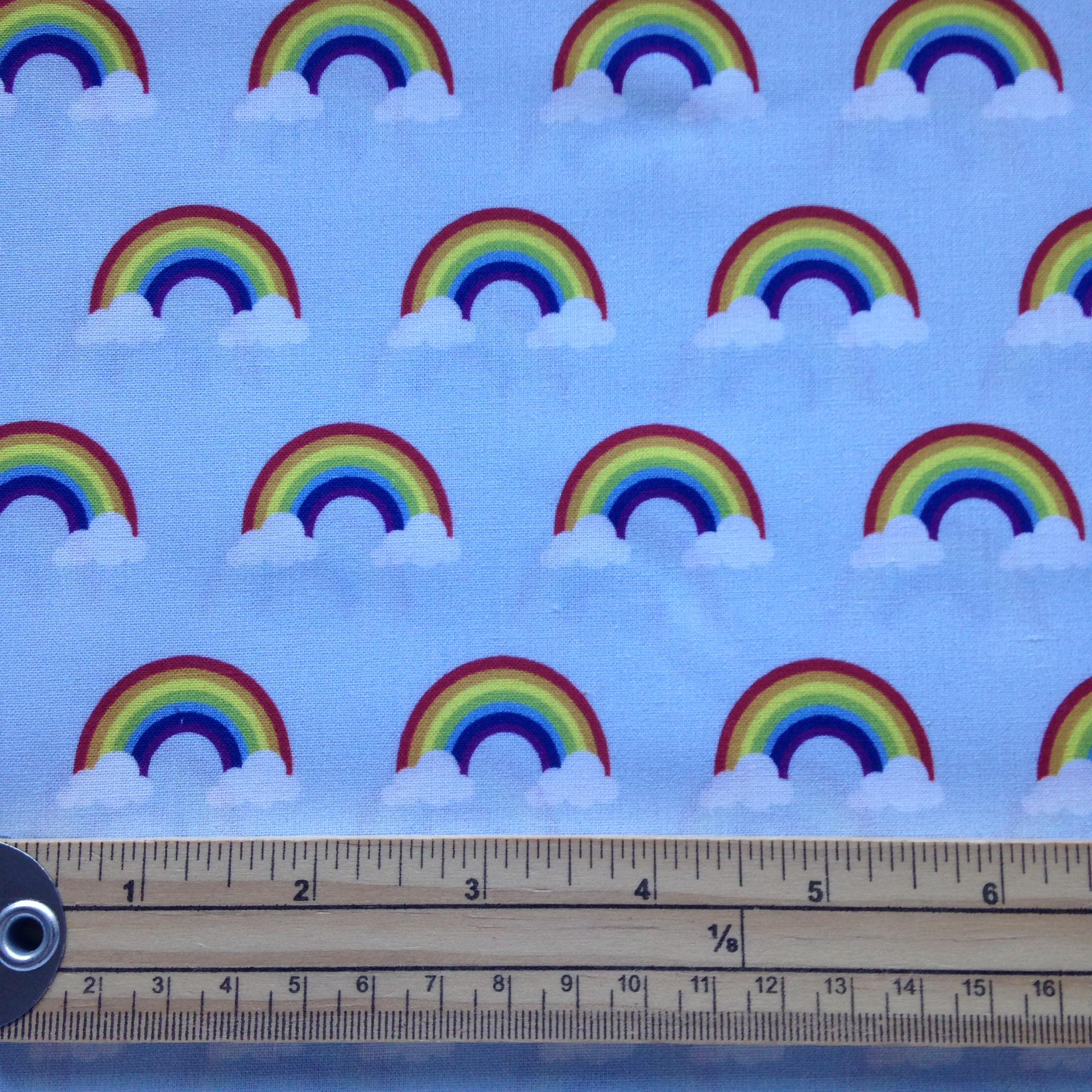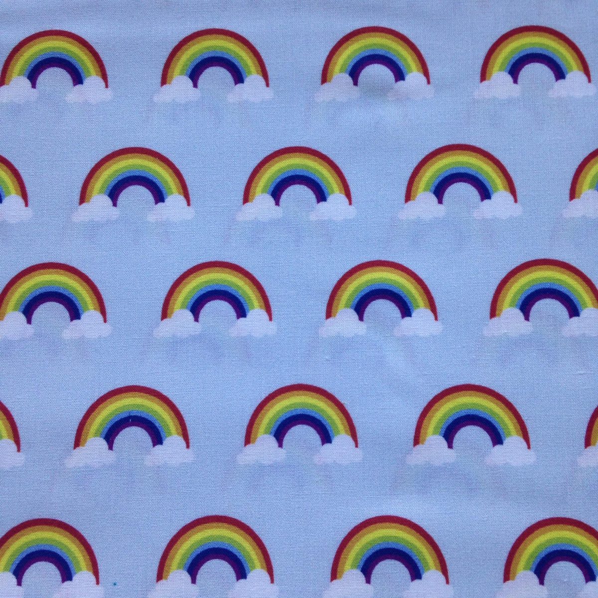 Quality digitally printed 100% cotton fabric from the Little Johnny range featuring rainbows and clouds on a sky blue background. Perfect for dressmaking, quilting, patchwork, craftwork, bunting etc.