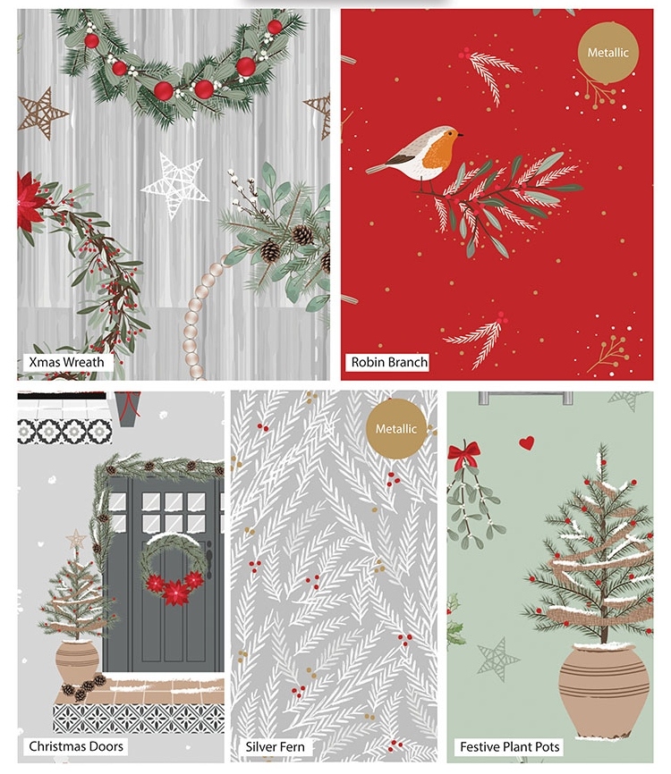 These lovely Welcome Home Robin & Wreath Christmas fat quarters by Victoria Louise Design for The Craft Cotton Company feature traditional Christmas icons including robins, wreaths, Christmas trees and foliage.