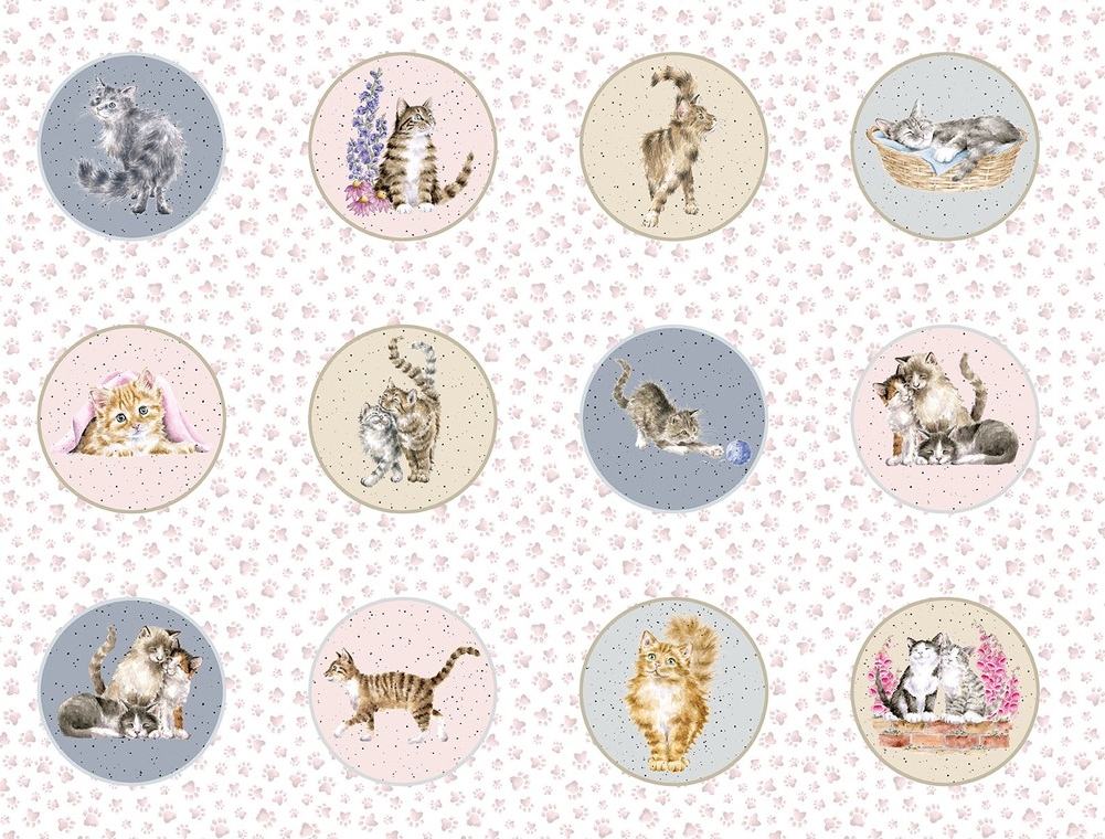 This cute Cat Cameos Panel is from the Whiskers and Paws collection by Hannah Dale of Wrendale Designs for Maywood Studio.  The panel measures approximately 70cm x 112cm and features 40 cat cameos in Hannah’s trademark watercolour-effect style.  Each cameo measures approximately 9.5cm in diameter.  The cameos sit on a background with a paw print design, echoing the background on the Cats Panel in the same collection.  This is a premium quality 100% cotton fabric, perfect for quilting, patchwork and craft projects and an ideal co-ordinate for the Cats Panel.  The panel can be cut into individual blocks measuring approximately 14cm x 14cm.